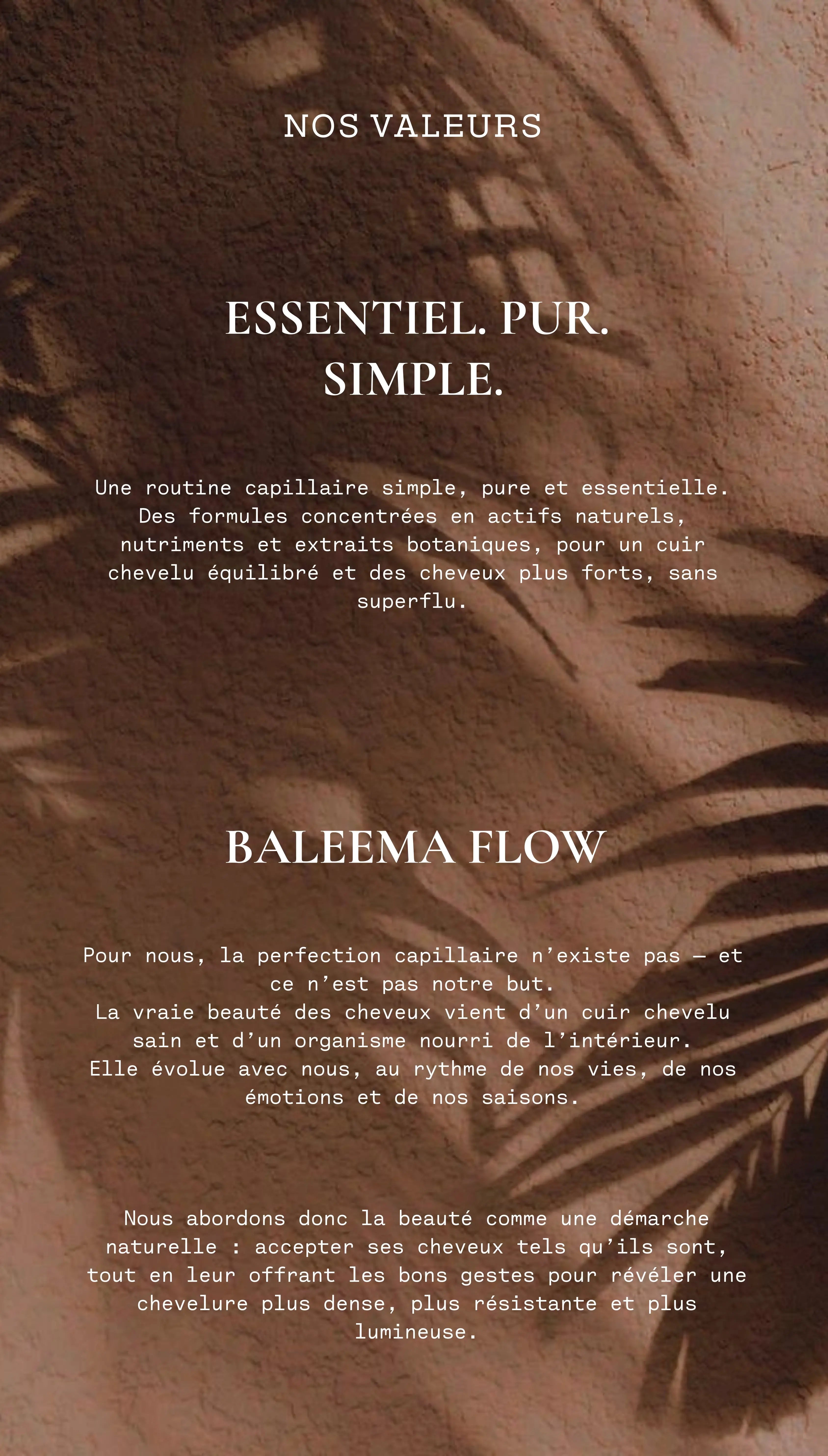 BALEEMA est née d’une expérience personnelle et d’un constat simple : la santé des cheveux commence bien avant les longueurs, elle prend racine dans le cuir chevelu et dans l’équilibre intérieur.